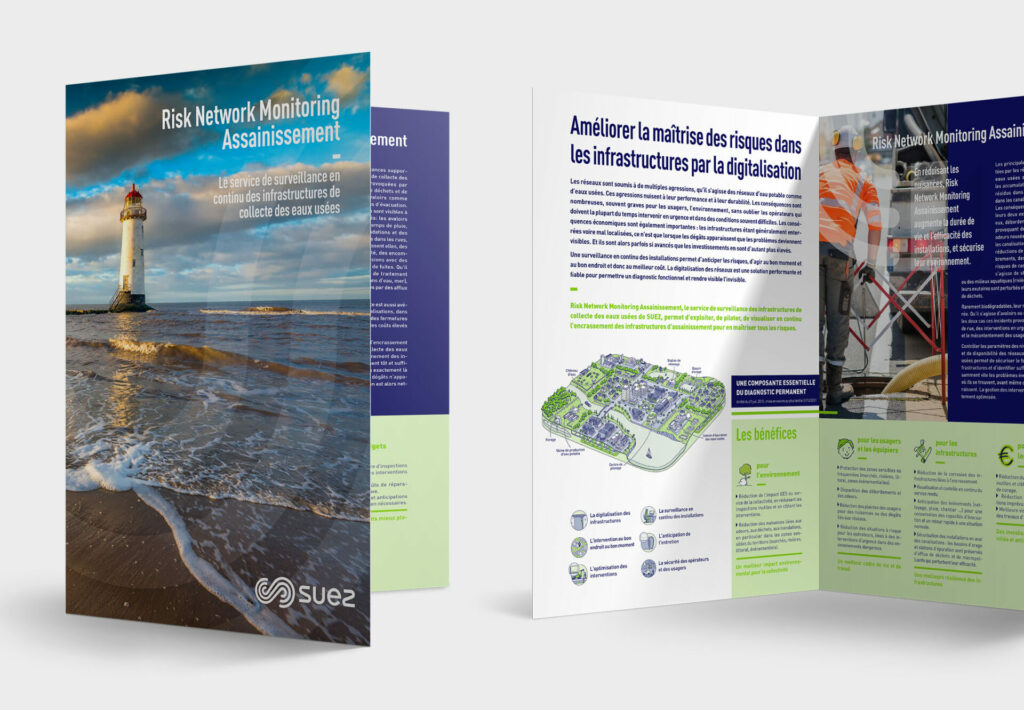 MarkediA a réalisé plus d’une trentaine de brochures et/ou fiches pour le Groupe SUEZ, dont une portant sur les offres du groupe dédiées au littoral : analyse des spécifications techniques, rédation des textes, conception graphique, infographie.